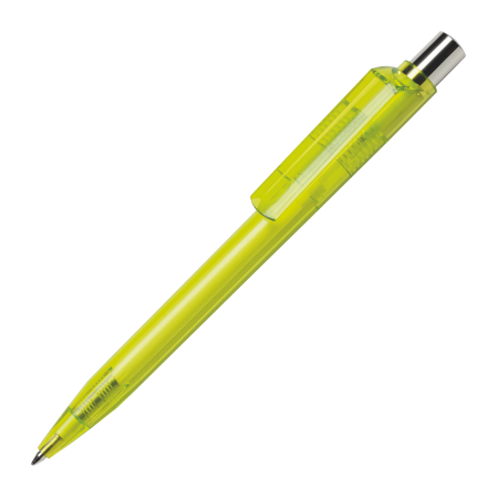 Das Gehäuse, das Drücker-Element und der Clip sind in 14 transparenten Farben lieferbar, die bereits ab 2.000 Stück untereinander kombinierbar sind. Der Drücker ist aus glänzendem Metall gefertigt. Der Kugelschreiber ist mit einer blauschreibenden Großraummine ausgestattet.
