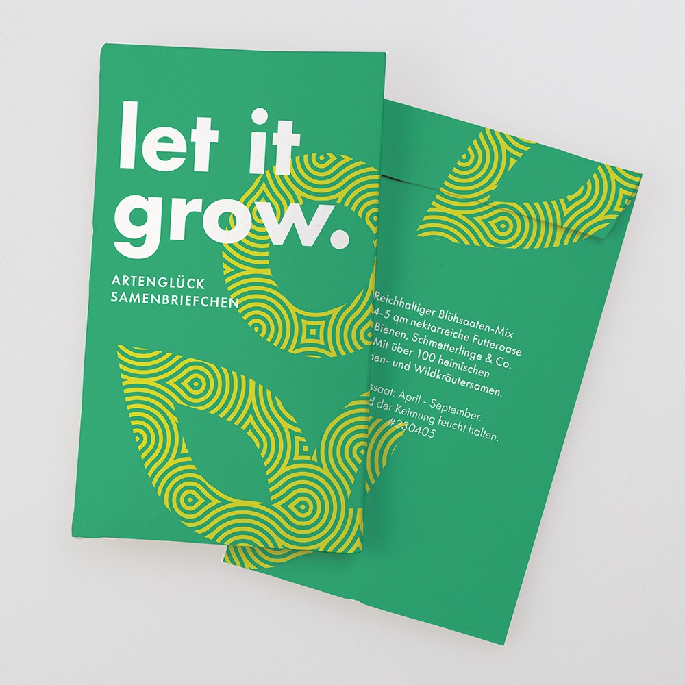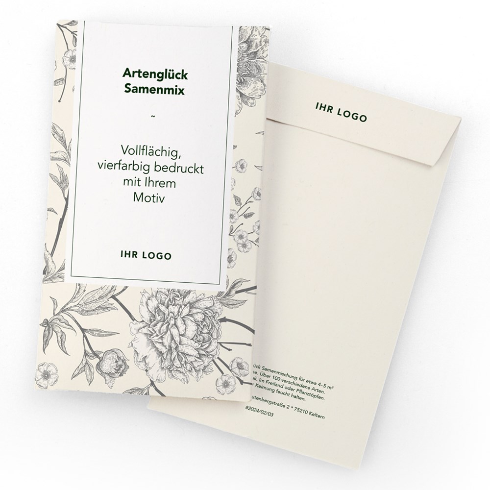 Wertiges Samenbriefchen aus weißem Karton gefüllt mit der reichhaltigen „Artenglück Hausmischung“. Ein hochwertiges und nachhaltiges Give-Away, ganz individuell in Ihrem Corporate Design. Schon ab 1.000 Stück vollflächig farbig bedruckt. Auch aus braunem Kraftpapier erhältlich.