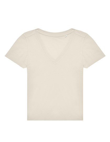 100% einlaufvorbehandelte, ringgesponnene Baumwolle | Single-Jersey | Klassische moderne Passform | Mit Seitennaht | Femininer Ausschnitt mit verstärktem V | Nackenband für sauberen Abschluss | Vorverlegte Schulternähte | Kein Label | Widerstandsfähiges Material mit weichem Griff