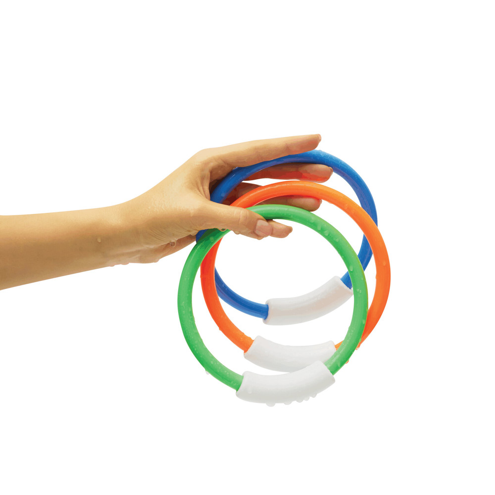 Tauchringe SPLASH LOOPS, 3-teilig: bestehend aus jeweils 1 Ring in blau, orange und grün, der weiße Teil des Rings füllt sich mit Wasser, durch das ungleich verteilte Gewicht stehen die Ringe senkrecht auf dem Beckenboden und lassen sich gut greifen, im Beutel mit Kordelzug