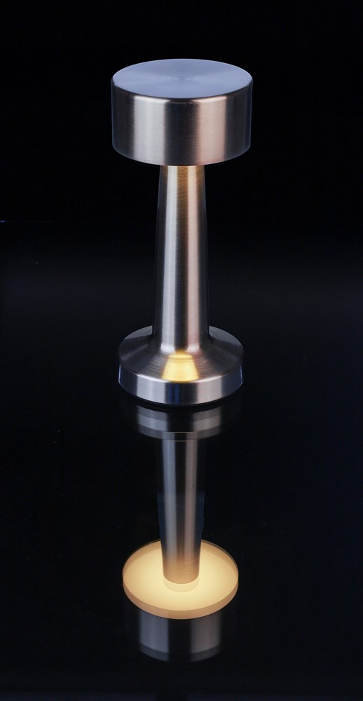 Tischleuchte aus Metall und ABS mit 24 LEDs und drei Lichtmodi (weiß, neutral, warm), die über einen Berührungssensor an der Oberseite gesteuert werden. Inklusive 800 mAh Akku und Ladegerät Typ C mit 1 m Kabel. Die Lampe ist dimmbar und verfügt über einen Ein-/Ausschalter an der Unterseite. Einzeln verpackt in braunem Karton.
