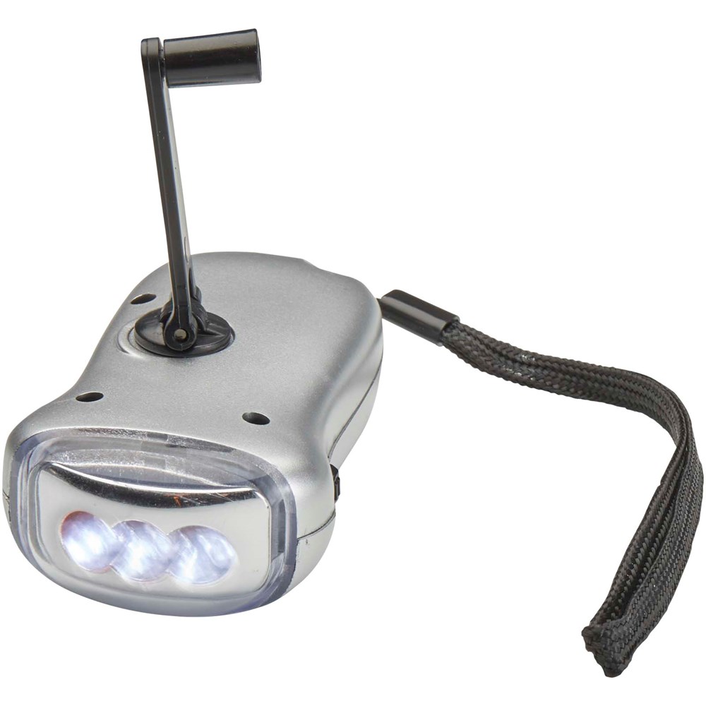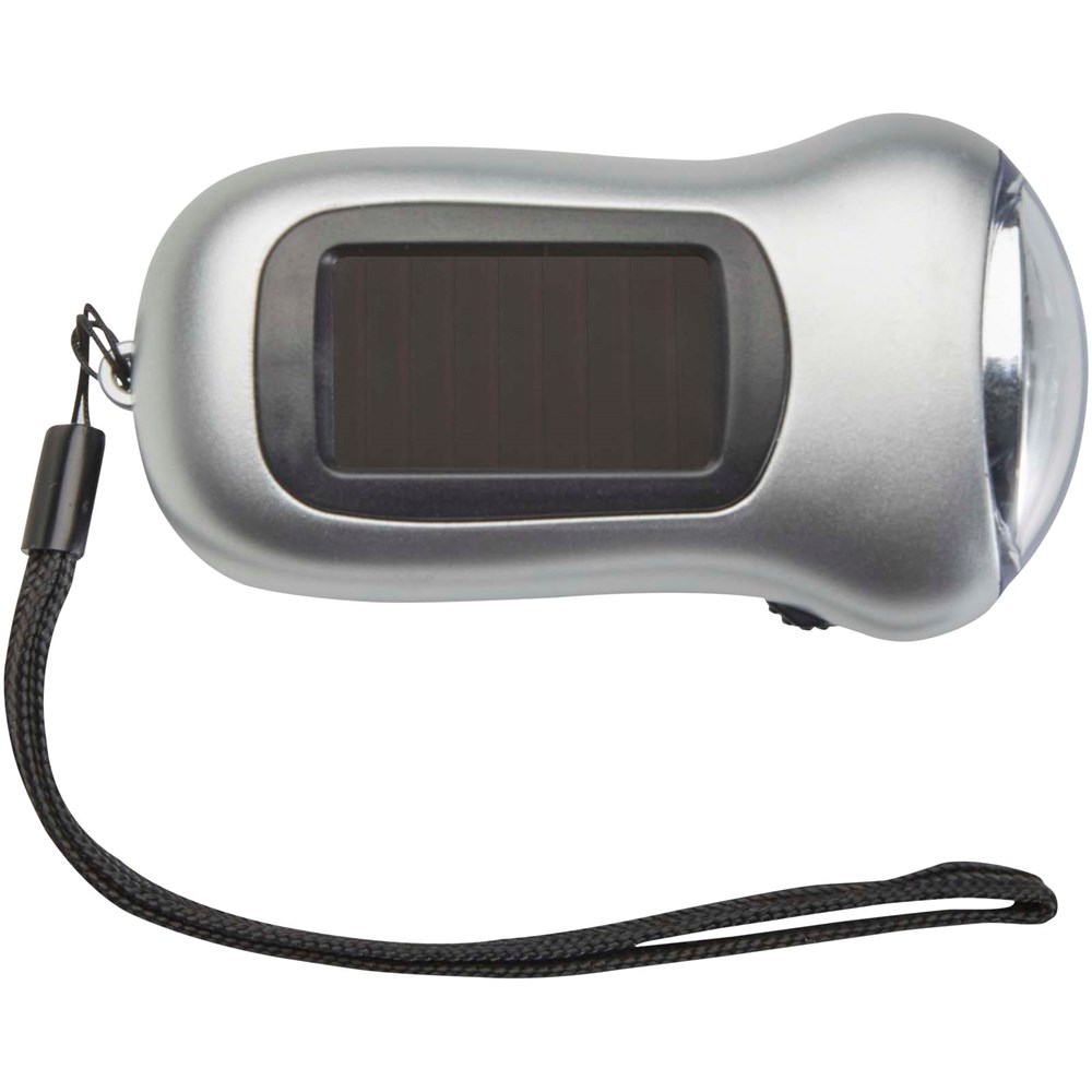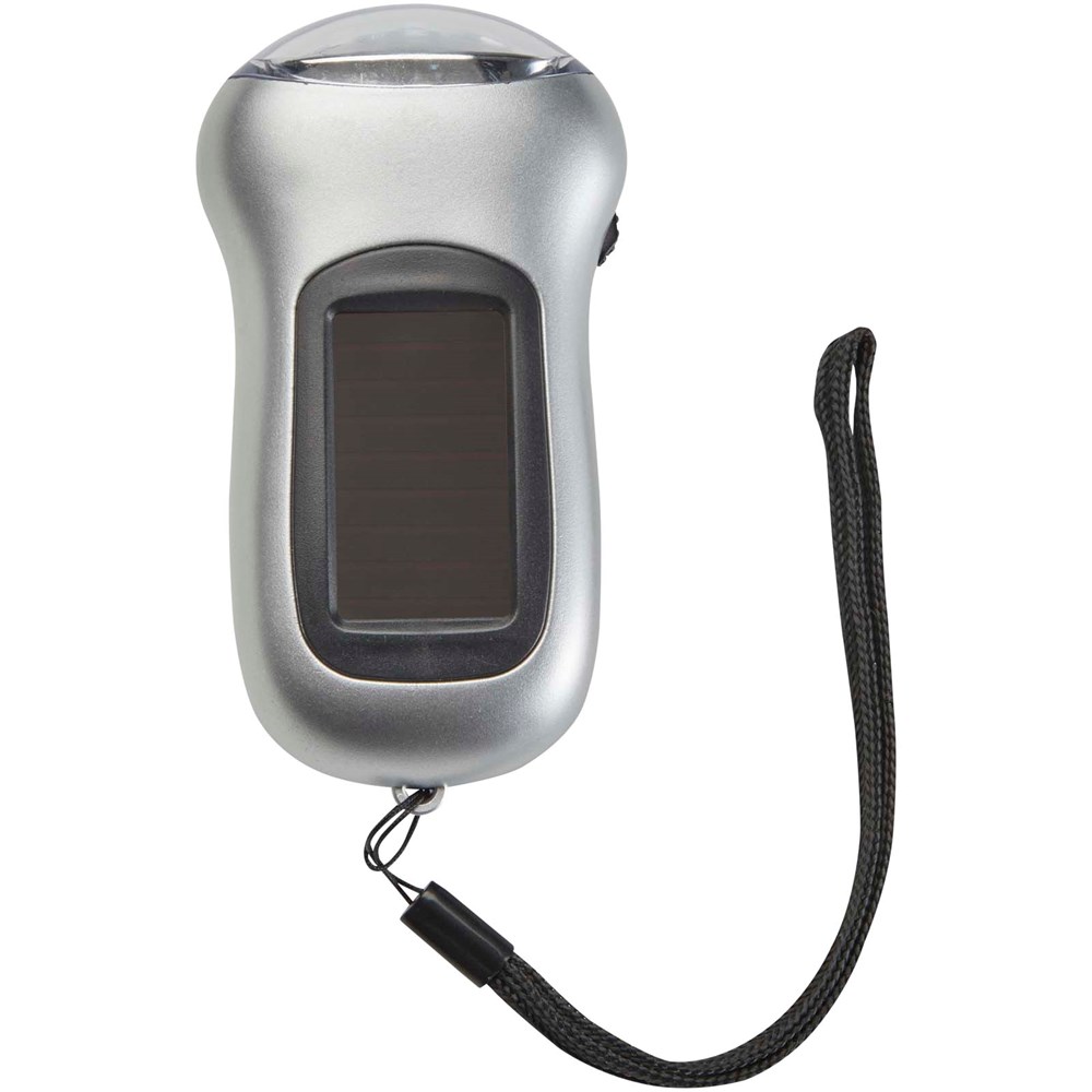 Kompakte Solartaschenlampe mit einer Leuchtstärke von 10.000 mcd. Die Taschenlampe kann durch Drehen des Griffs auch manuell betrieben werden.