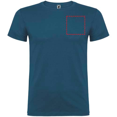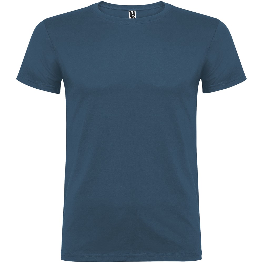 Kurzärmeliges T-Shirt mit doppellagigem Rundhalsausschnitt aus Elasthan, hergestellt aus schlauchförmigem Material für Erwachsene. Verstärkte und verdeckte Nähte am Kragen. Herausnehmbares Etikett. Das Modell ist 190 cm groß und trägt Größe L.