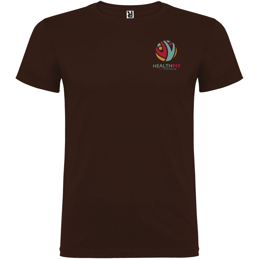 Kurzärmeliges T-Shirt mit doppellagigem Rundhalsausschnitt aus Elasthan, hergestellt aus schlauchförmigem Material für Erwachsene. Verstärkte und verdeckte Nähte am Kragen. Herausnehmbares Etikett. Das Modell ist 190 cm groß und trägt Größe L.