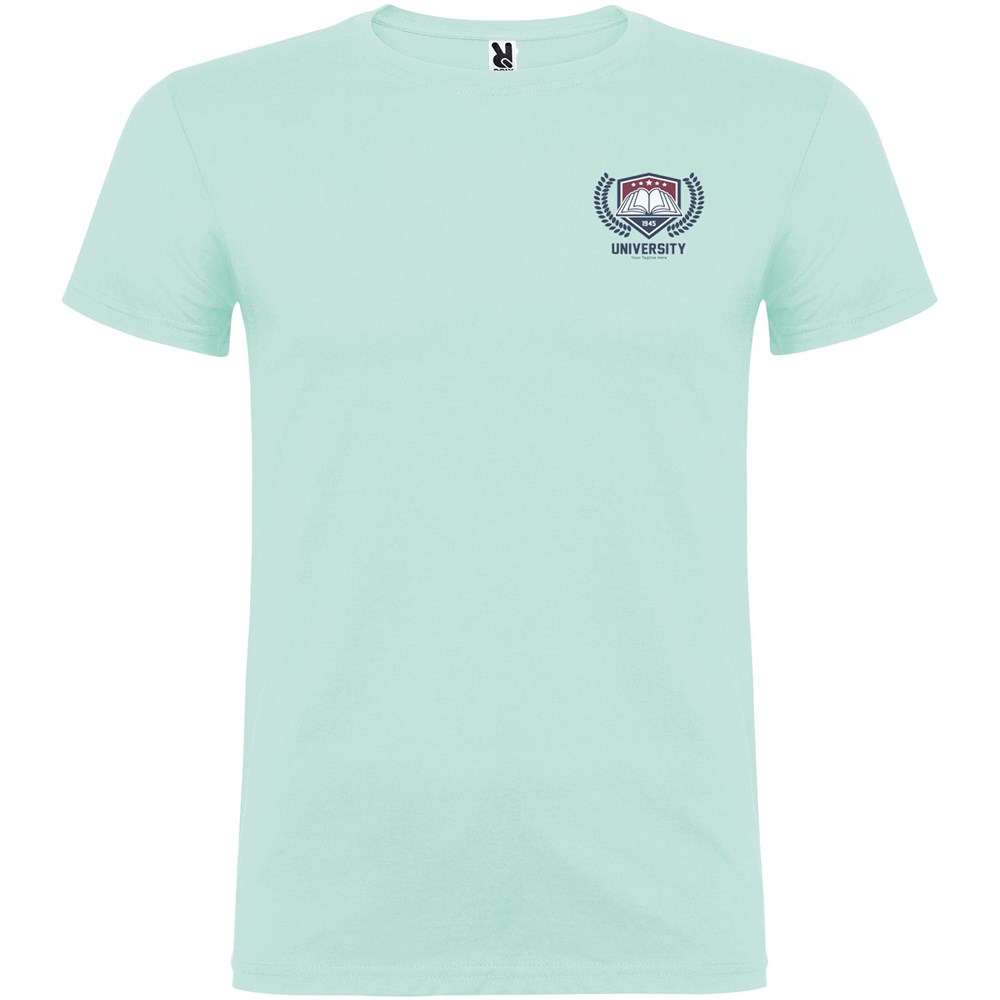 Kurzärmeliges T-Shirt mit doppellagigem Rundhalsausschnitt aus Elasthan, hergestellt aus schlauchförmigem Material für Erwachsene. Verstärkte und verdeckte Nähte am Kragen. Herausnehmbares Etikett. Das Modell ist 190 cm groß und trägt Größe L.