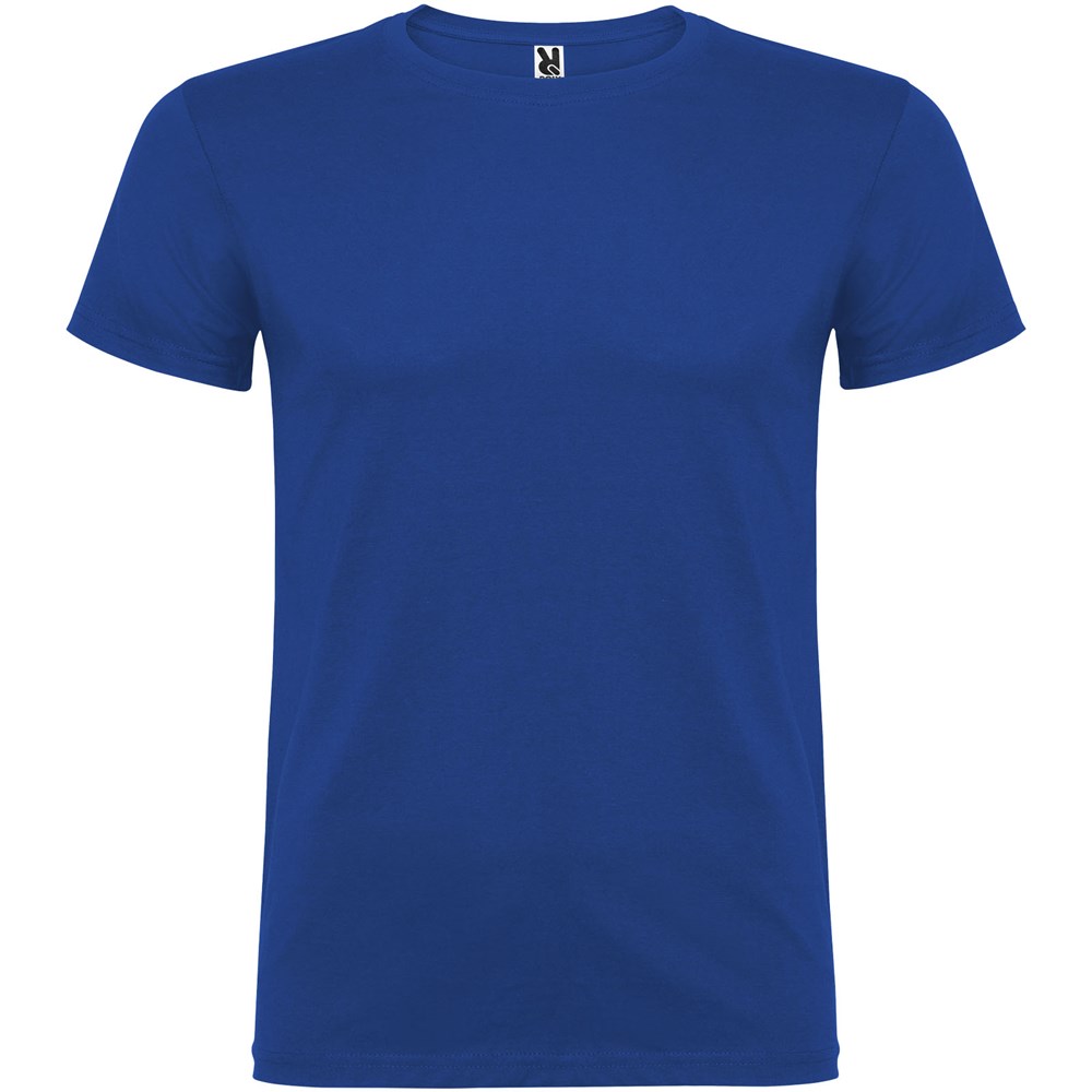 Kurzärmeliges T-Shirt mit doppellagigem Rundhalsausschnitt aus Elasthan, hergestellt aus schlauchförmigem Material für Erwachsene. Verstärkte und verdeckte Nähte am Kragen. Herausnehmbares Etikett. Das Modell ist 190 cm groß und trägt Größe L.