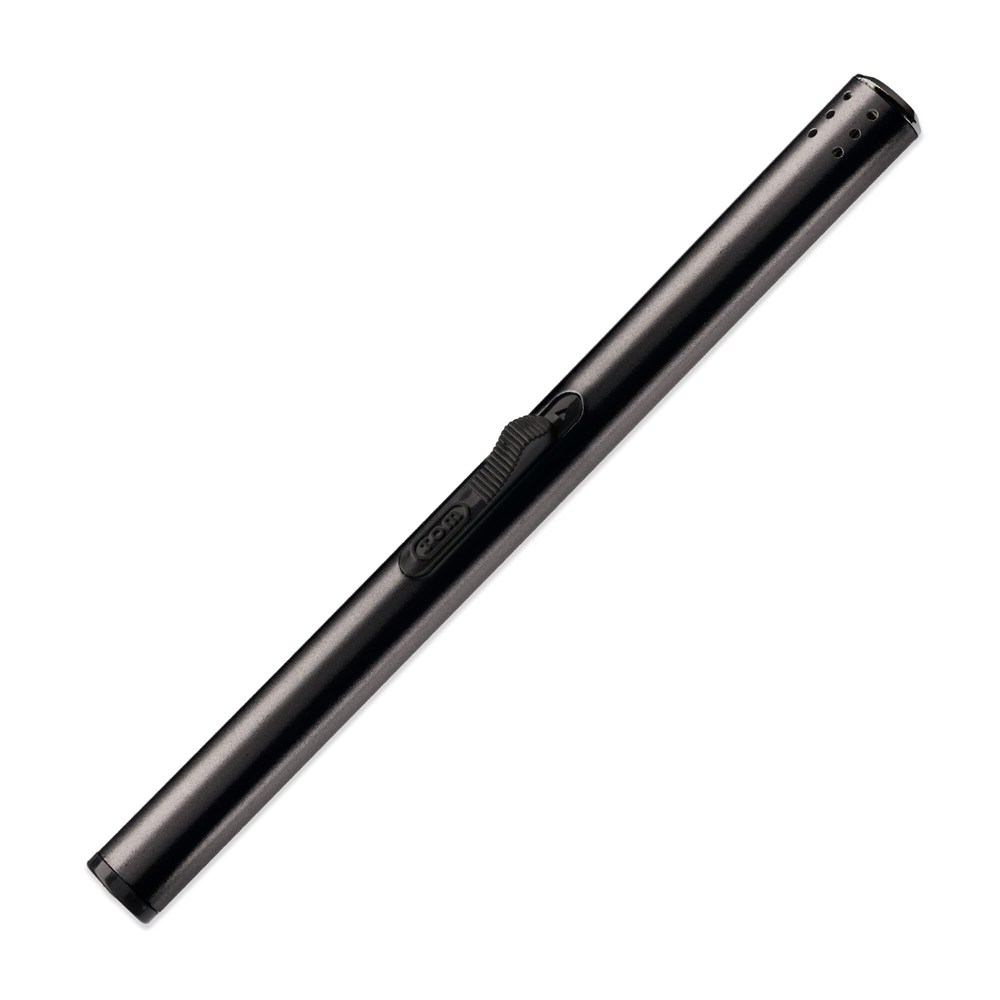 Langes schlankes Feuerzeug - praktisch zum Anzünden von Kerzen. Aluminium, Schiebeknopf an der Seite. Nachfüllbar.