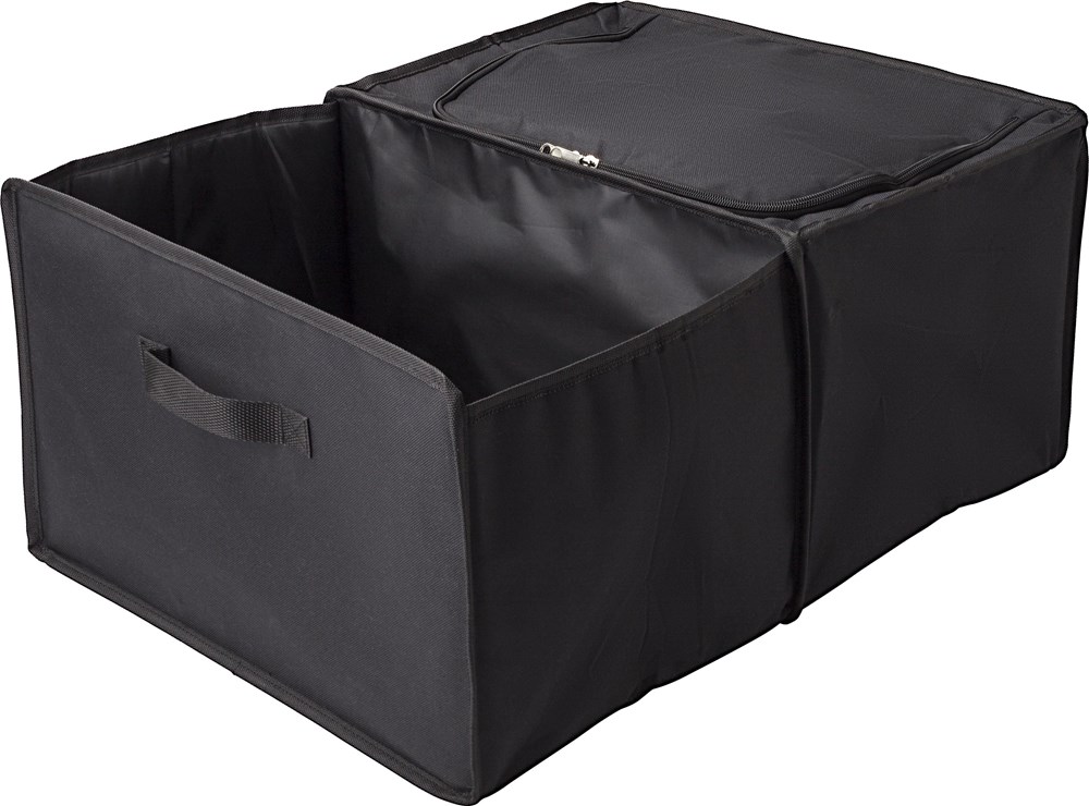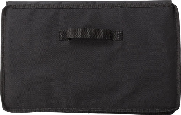 Autotasche aus Polyester (600D). Zwei Fächer, eine Kühltasche mit Reißverschluss geschlossen. Aluminium innen auf der Seite der Kühltasche. Zusammenklappbar.