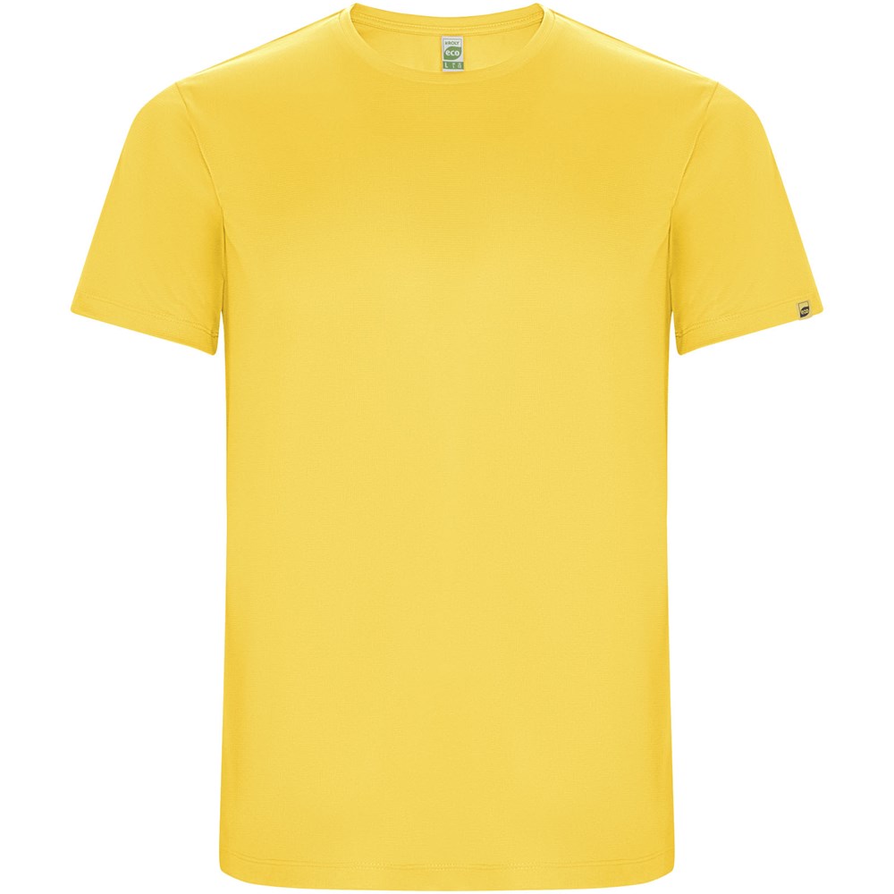 Funktions-T-Shirt aus recyceltem Polyester CONTROL DRY. Rundhalsausschnitt mit farblich abgesetzten Nähten. ECO-Logo-Etikett am Ärmel. Verpackung aus Recyclingmaterial. Herausnehmbares ECO-Etikett. Verpackung aus Recyclingmaterial. Technisches Gewebe. Das Modell ist 180 cm groß und trägt Größe M.