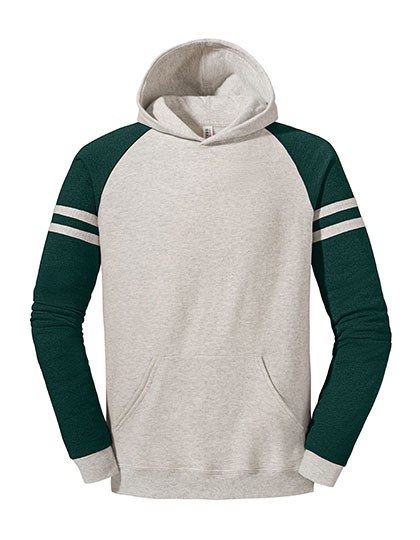 NuBlend® vorgeschrumpftes, pilling-resistentes 2-Enden-Fleece | Hergestellt aus nachhaltig erzeugter, in den USA angebauter Baumwolle | Hohe Maschendichte für eine glatte Druckfläche | Body in Oatmeal Heather für einen modernen, gleichzeitig zurückhaltenden Look | Kontrastfarbene Raglanärmel | Sportlich inspirierte College-Streifen an den Ärmeln | Kängurutasche vorne | Ärmelbündchen und Bund aus 1x1-Rippstrick (Ärmelbündchen passen zu den College-Streifen) | Vierteldrehung zur Vermeidung der Mittelfalte