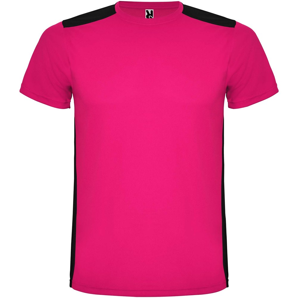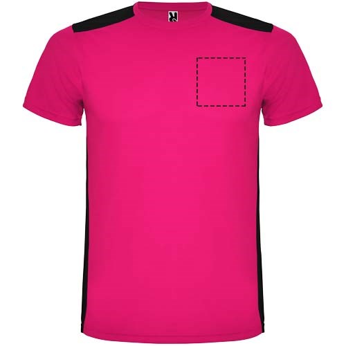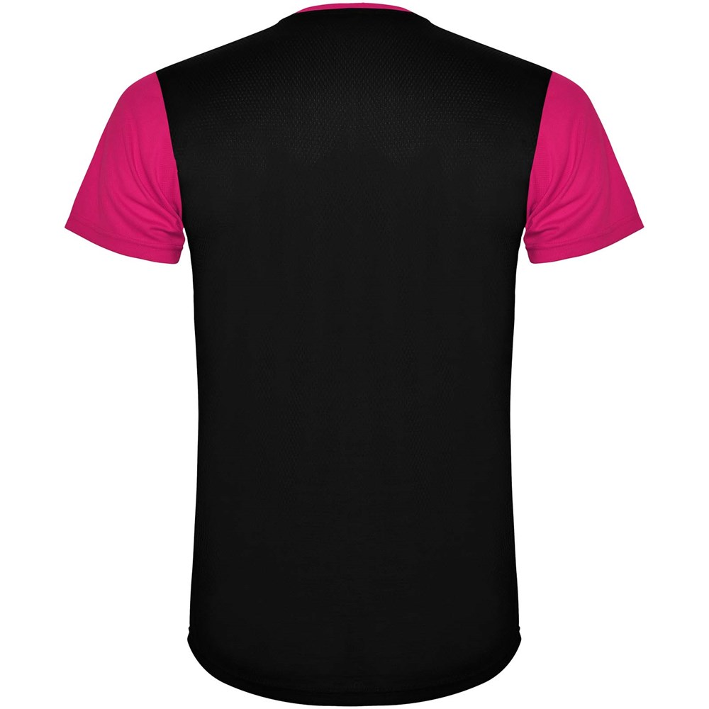 Funktions-T-Shirt aus atmungsaktivem Stoff. Rundhalsausschnitt. Kombination aus zwei Polyestergeweben im Rücken- und Schulterbereich. Polyester Bienenwabe Vorne und 3D-Netz Polyester auf Schulter und Rücken. Material ist feuchtigkeitabsorbierend. Ziernähte auf den Schultern und Seiten. Schnitt mit verlängertem Rückenteil. Abnehmbares Etikett.
