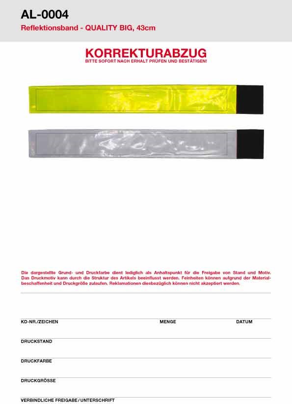 Unsere Reflektionsbänder QUALITY werden nach EN17353 produziert. Die hochwertige Glodian Folie in gelb oder weiß ist direkt bedruckbar. Der breite Klettverschluss verleiht jedem Band einen sicheren Halt.