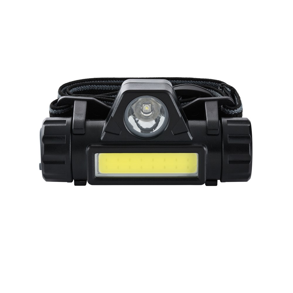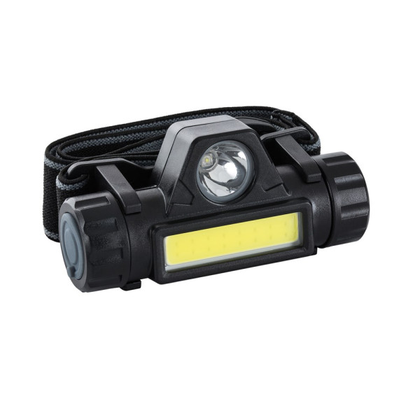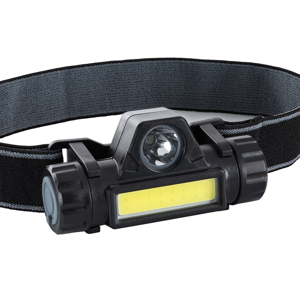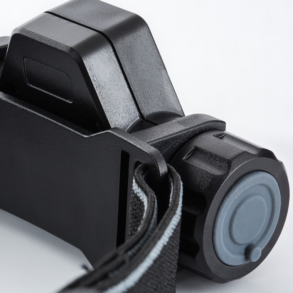 Die Stirnlampe mit verstellbarem und strapazierfähigem Gummiband verfügt über eine 100 Lumen starke LED und eine 150 Lumen starke COB-Leuchte. Die Leuchte kann vom Band abgenommen werden und über einen Magneten zur Beleuchtung an magnetischen Oberflächen befestigt werden. Ein Akku ist integriert und kann über einen vor Spritzwasser geschützten USB-C Port geladen werden. Die Leuchtzeit beträgt circa 2h.