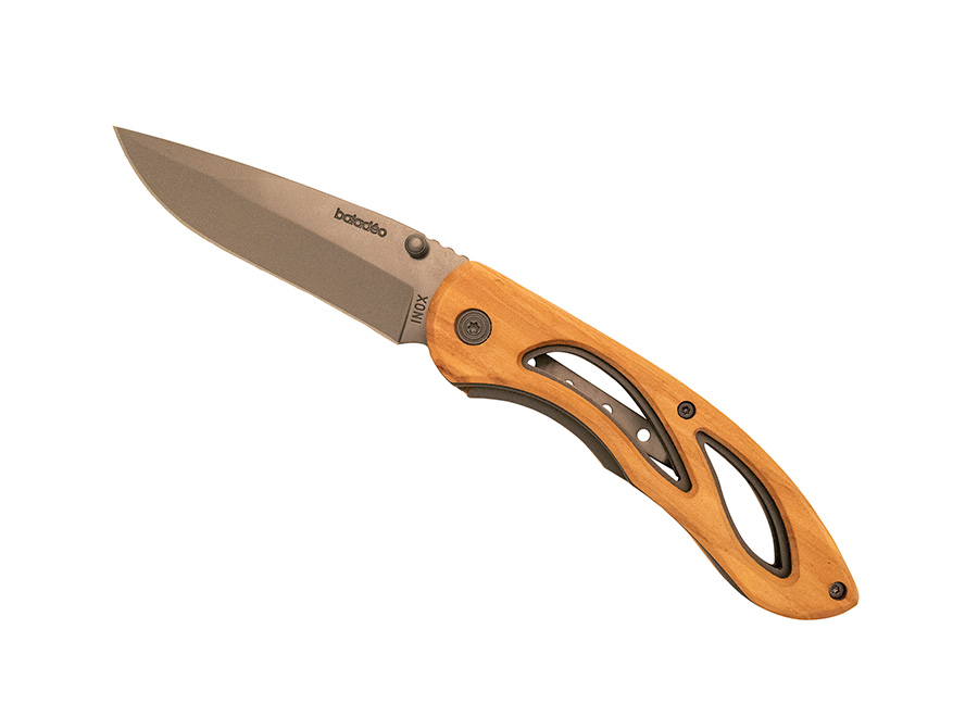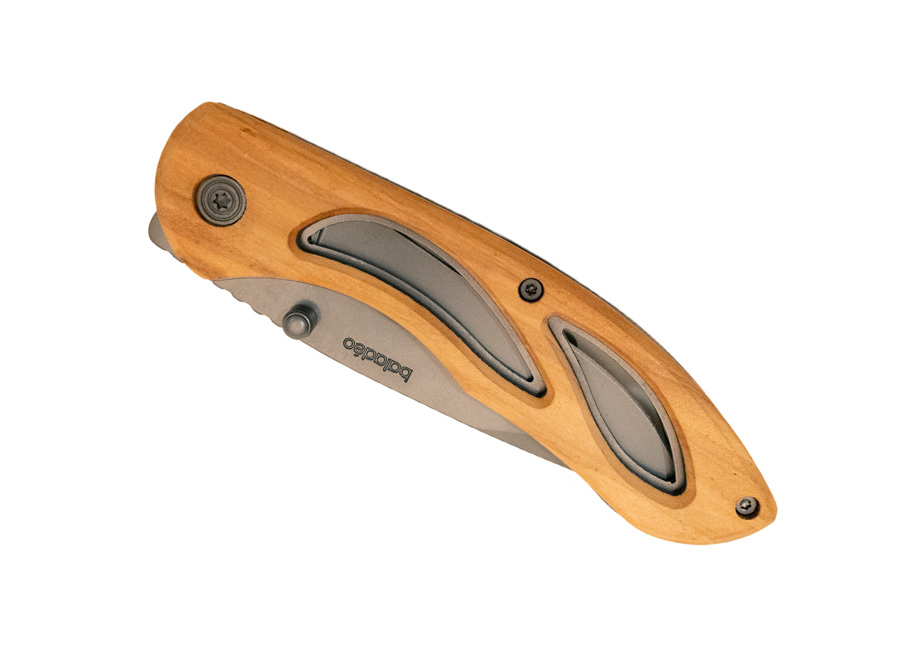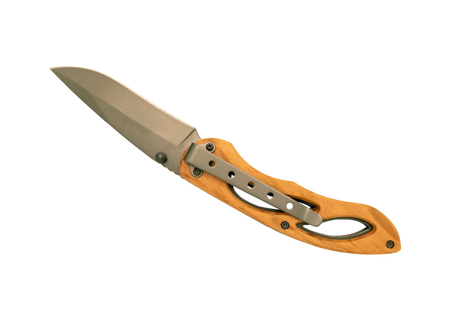 Klappbares Messer mit Klinge aus 420er Edelstahl und Titanbeschichtung. Montage mit Torx-Schrauben. Griff aus Olivenholz. Einhändiges Öffnen/ Schließen mit einem Liner-Lock Sicherheitsmechanismus. Gürtelclip. Wird in einem melierten grauen Etui aus RPET geliefert.