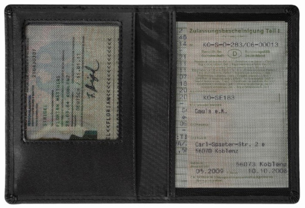 Ausweistasche aus Rindleder mit Teilabdeckung zum Verstecken der Adresse auf dem KFZ-Schein. Gebugt, VPE 500. 2 Netzfächer