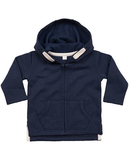 Zertifizierung als Bio-Baumwolle in Arbeit/ recyceltes Polyester (rPET) | Weiche, innen angeraute Kapuzen-Jacke für Babys mit durchgehendem Reißverschluss | 3-teilige Kapuze für eine optimale Passform | Flatlock-Nähte | Naturfarbenes Fischgrät-Nackenband | Veredelbarer Patch im Nacken | Kängurutasche | Gerader Saum mit Seitenschlitzen und verlängertem Rücken | Fischgrät-Detail an der Kapuze / Angedeutete Kordeln | Abreißbares Nackenetikett
