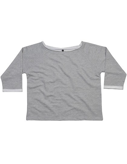 Zertifizierung als Bio-Baumwolle in Arbeit/ Recyceltes Polyester (rPET) | French Terry | Loose Fit Passform | Ungesäumter Halsausschnitt | Weiter, schulterfreier Ausschnitt | Gerollte Ärmel in ¾-Länge | Gerader Saum | Raglan-Ärmel | Abreißetikett