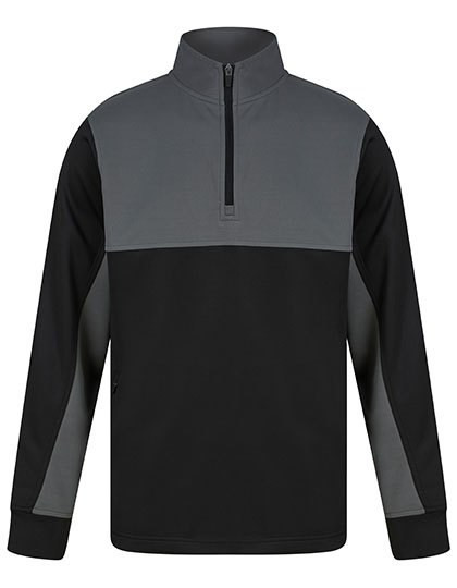 Kontrastierende Einsätze oben an der Brust und an den Ärmeln in Kontrastfarben | 1/4-Reißverschluss | Seitenblenden | Nylon-Reißverschlüsse auf der Rückseite an den mittleren Vorder- und Seitentaschen | 1x1-Ripp-Ärmelbündchen | Halbautomatischer Reißverschluss-Zipper