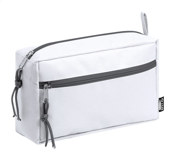Kosmetik-Tasche aus RPET mit zwei Reißverschluss-Fächern. Mit RPET-Label.