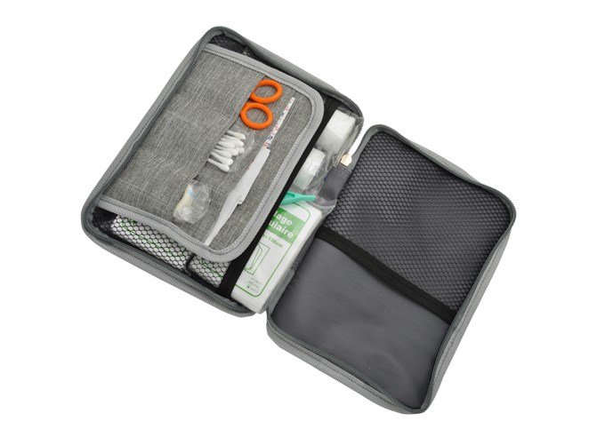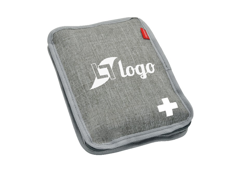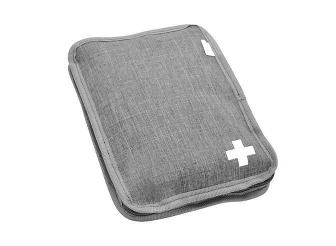 Erste-Hilfe-Set in meliertem grauem Wulong-Gewebe, bestehend aus folgenden Elementen: Schere, Kunststoffpinzette, Latexhandschuhe, Pflaster, vier alkoholgetränkte Kompressen, zehn Wattestäbchen, acht selbstklebende elastische Verbände 1 cm x 4 cm, 1 flexible Bandage 5 cm, 1 flexible Bandage 10 cm, zwei Dreieckstücher, fünf sterile Kompressen 7,5 x 7,5 cm, vier antiseptische Tücher.